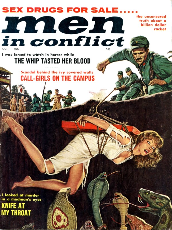 As shown here, examples can found in many different men’s pulp mags, including ACTION FOR MEN, ALL MAN, CHAMPION FOR MEN, FOR MEN ONLY, MAN’S ACTION, MAN’S BOOK, MAN’S DARING, MAN’S EXPLOITS, MAN’S TRUE DANGER, MEN IN CONFLICT, MEN TODAY, RAGE FOR MEN, REAL MEN, WILDCAT ADVENTURES and WORLD OF MEN.