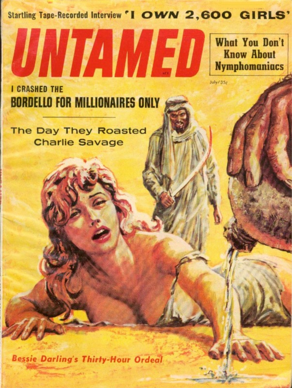 For the July 1959 issue of Untamed, Emsh painted a classic “Arab peril” cover. It shows a scantily clad, obviously thirsty damsel being menaced by a sheik carrying a bloody sword. Meanwhile, someone in the foreground is taunting the poor girl by pouring water onto the sand in front of her. (Now, that’s just nasty!) This Emsh cover painting goes with the story “Bessie Darling’s Thirty-Hour Ordeal.”