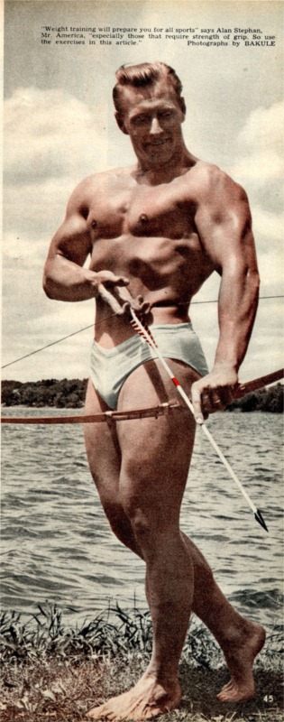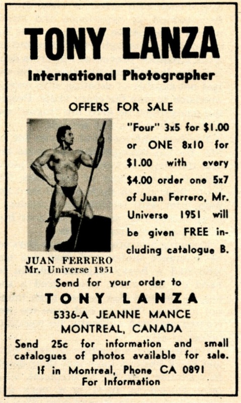 Below are some examples from the May ‘53 issue that were printed as lush duotones. From left to right, they feature bodybuilders Guy Higgens, Malcom Brenner and Alan Stephan.