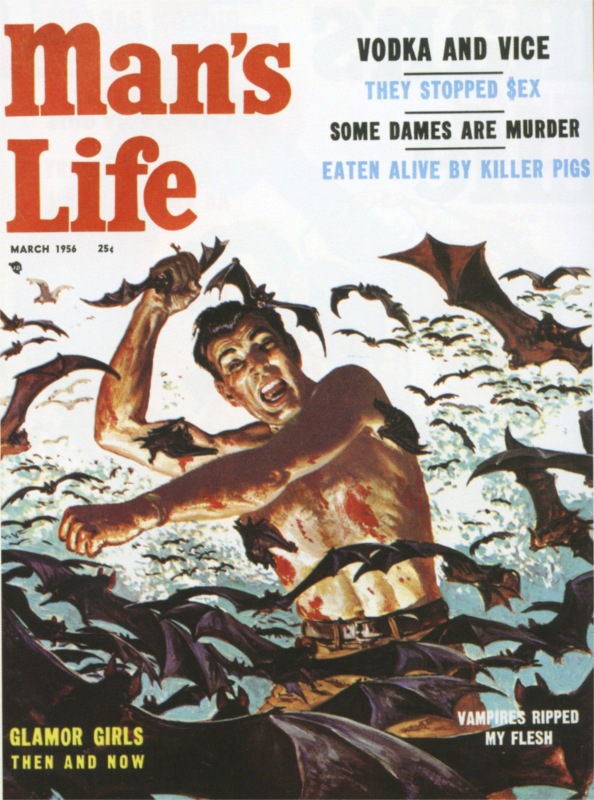 As the last example shows, the classic weasels headline wasn’t the only use of the “creatures + ripped + my flesh” riff. And, it wasn’t the first. Before the editors of Man’s Life used the famed weasel words, they used VAMPIRES RIPPED MY FLESH on their March 1956 cover. (Click and expand the JPEG at right and you’ll see the headline in the lower right hand corner.)