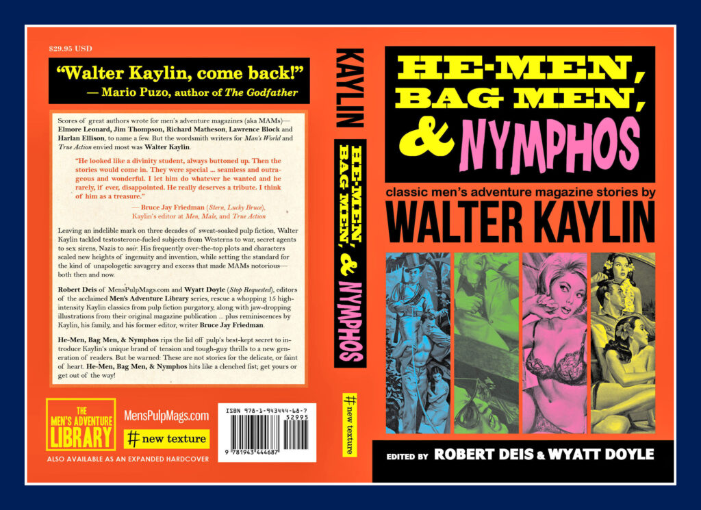 Walter Kaylin, who I talked to many times before he passed away in 2017, was one of the best and most versatile writers of men’s adventure magazine stories. Wyatt Doyle and I worked with Walter to publish an illustrated collection of his MAM stories titled HE-MEN, BAG MEN & NYMPHOS before he passed away in 2017. It was originally printed as a black-and-white paperback not long before Walter died. Last year, we published new, expanded, full color, deluxe hardcover and trade paperback editions HE-MEN, BAG MEN & NYMPHOS.