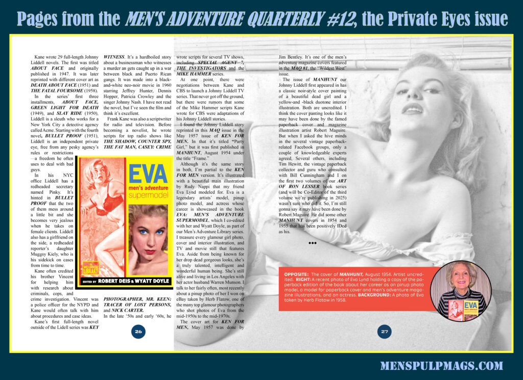 Next up is “Party Girl” by Frank Kane, from KEN FOR MEN, May 1957. Kane authored over 40 novels and scores of short stories that feature P.I. character Johnny Liddell. “Party Girl” is one of them. The model artist Rudy Nappi used for his depiction of the alluring girl was my friend Eva Lynd. Eva is a legendary artists’ model, pinup photo model, and actress whose career is showcased in the book EVA: MEN’S ADVENTURE SUPERMODEL, which I co-edited with her and Wyatt Doyle