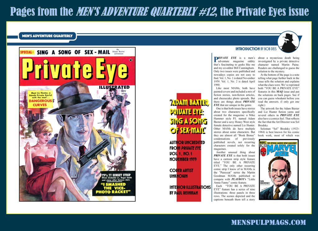 MAQ #12 reprints two detective stories and several unique special features from the magazine PRIVATE EYE, a short-lived men’s adventure mag oddity. Only two issues were published: one in November 1959 and the second in April 1960. Like most MAMs, both of those have painted covers and include a mix of fiction stories, non-fiction articles, and cheesecake photo spreads.