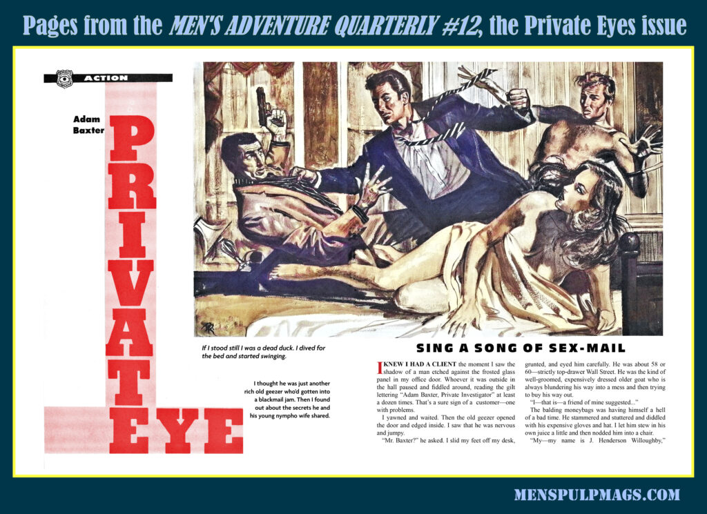 It features classic stories about detectives from magazines published in the 1950s, 1960s and 1970s. And, like all MAQ issues, MAQ #12 showcases high-resolution scans of the classic cover and interior artwork originally used for the stories, a fantastic layout by my co-editor Bill Cunningham, background commentary on the stories, and exclusive articles related to the issue’s theme written by written some of our pulp culture friends.