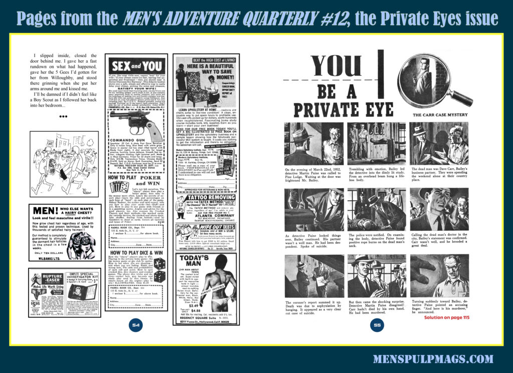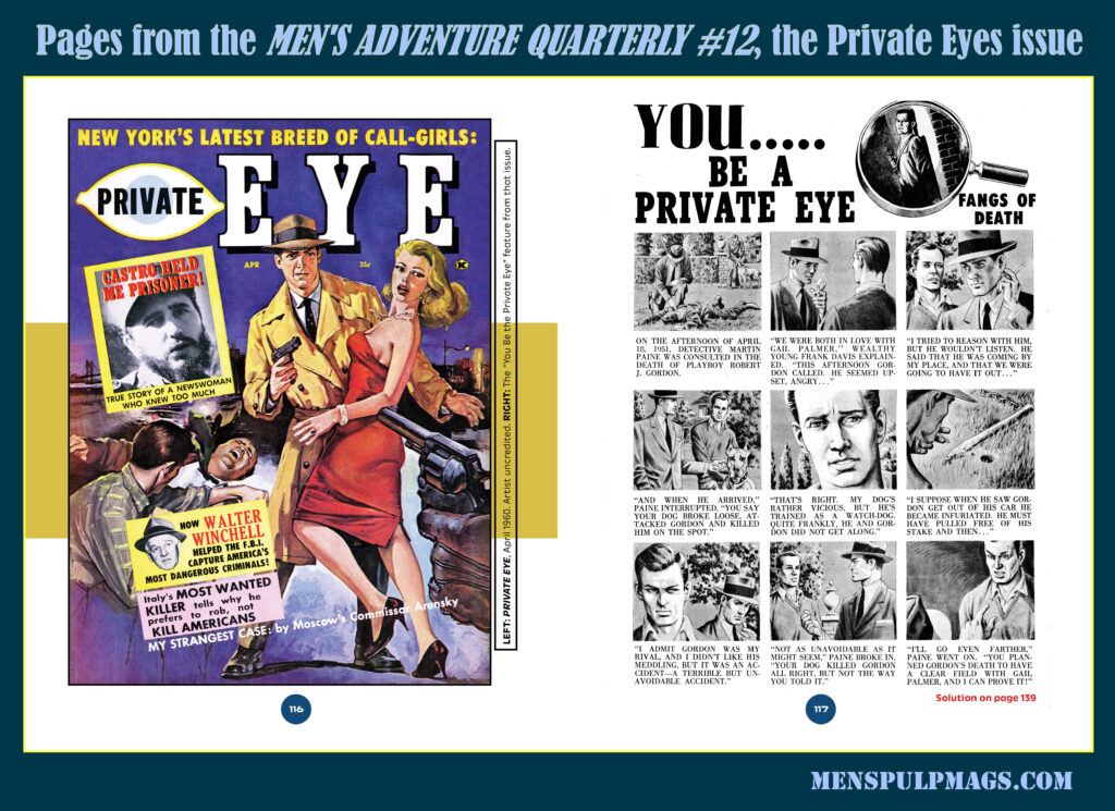 Another unusual thing about PRIVATE EYE is that both issues have a cartoon strip style feature titled “YOU BE A PRIVATE EYE.” We’ve included those in MAQ #12. We challenge you to guess the solution to the mysteries they describe—without looking up the answers printed further back in the issue