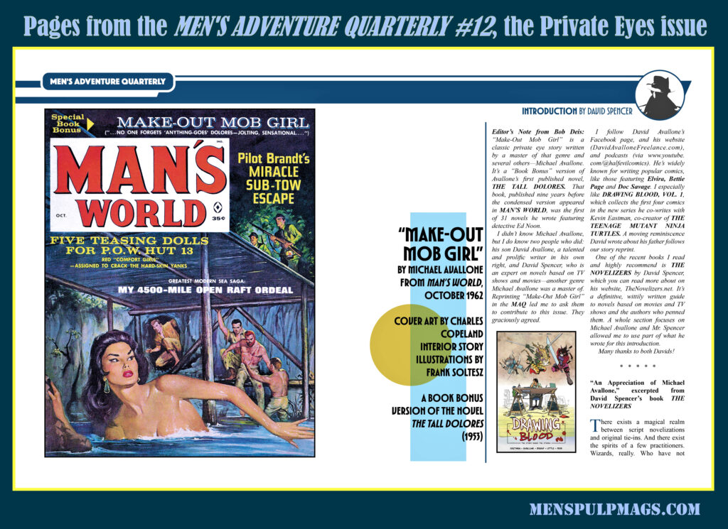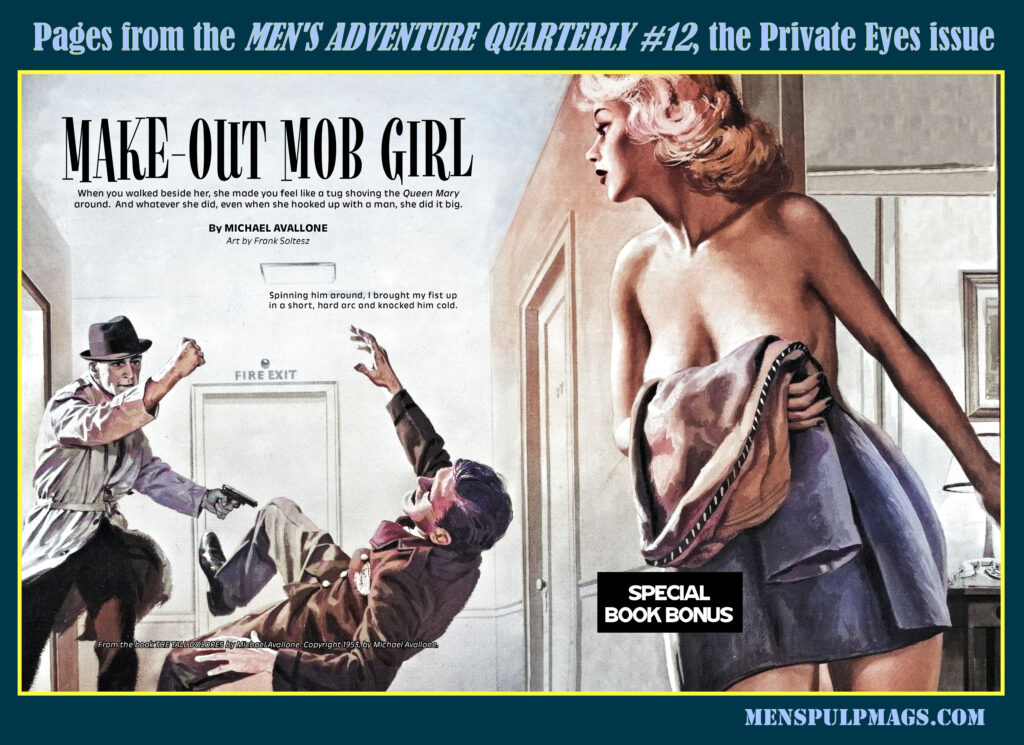 The Michael Avallone story in MAQ #12 is “Make-Out Mob Girl.” It’s a “Book Bonus” version of his novel THE TALL DOLORES from MAN’S WORLD, October 1962. That novel, originally published in 1953, was the first of 32 novels Avallone wrote featuring Private Eye Ed Noon.