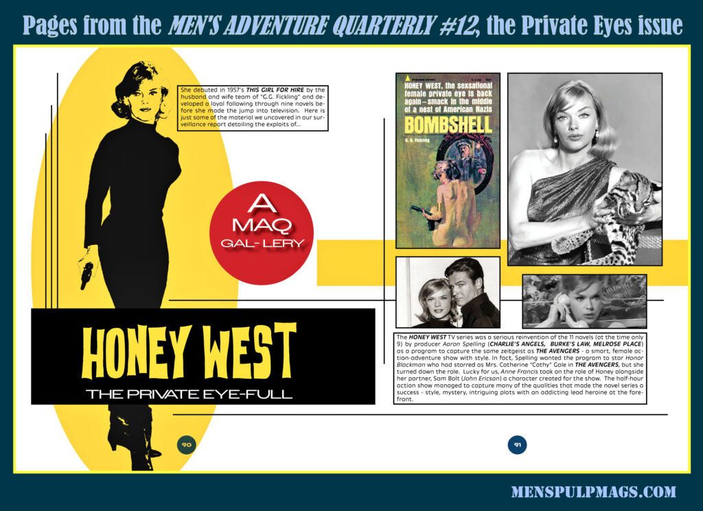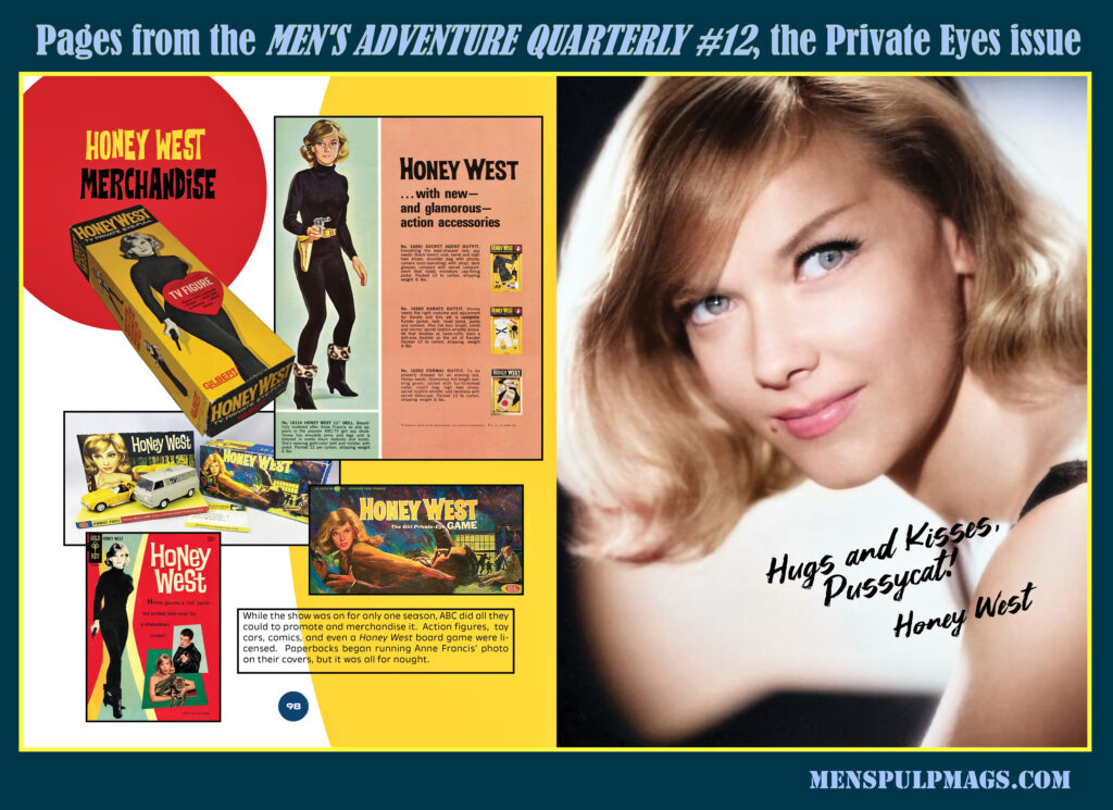 Bill Cunningham and I love Honey West, especially the 1965-1966 HONEY WEST TV series starring Anne Francis as Honey. In fact, Bill created eye-popping, detailed guide to the show that’s included as a special feature in MAQ #12.