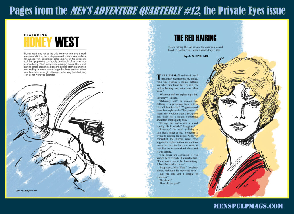 After that comes “The Red Hairing” by G.G. Fickling. It’s the only short story featuring the beautiful and brainy female detective Honey West ever published. G.G. Fickling is the pseudonym Forrest “Skip” Fickling and his wife Gloria used for the eleven Honey West novels they wrote together between 1957 and 1971. “The Red Hairing” was published in the June 1965 issue of MIKE SHAYNE MYSTERY MAGAZINE.