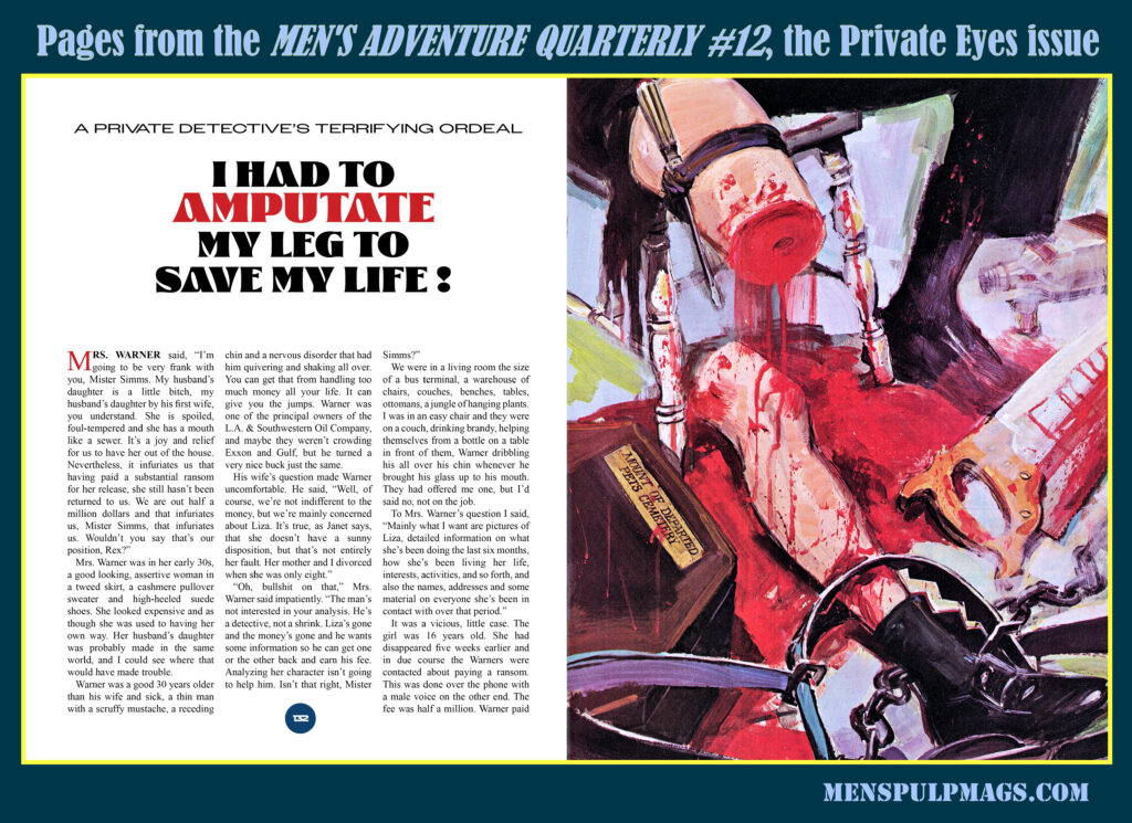 The last story in MAQ #12 is an especially wild one, as you can tell from the title—“I Had To Amputate My Leg To Save My Life!”—and the grisly illustration done for it by artist Bruce Minney. It was originally published in FOR MEN ONLY, June 1977 and written by Walter Kaylin under his common pseudonym Roland Empey.