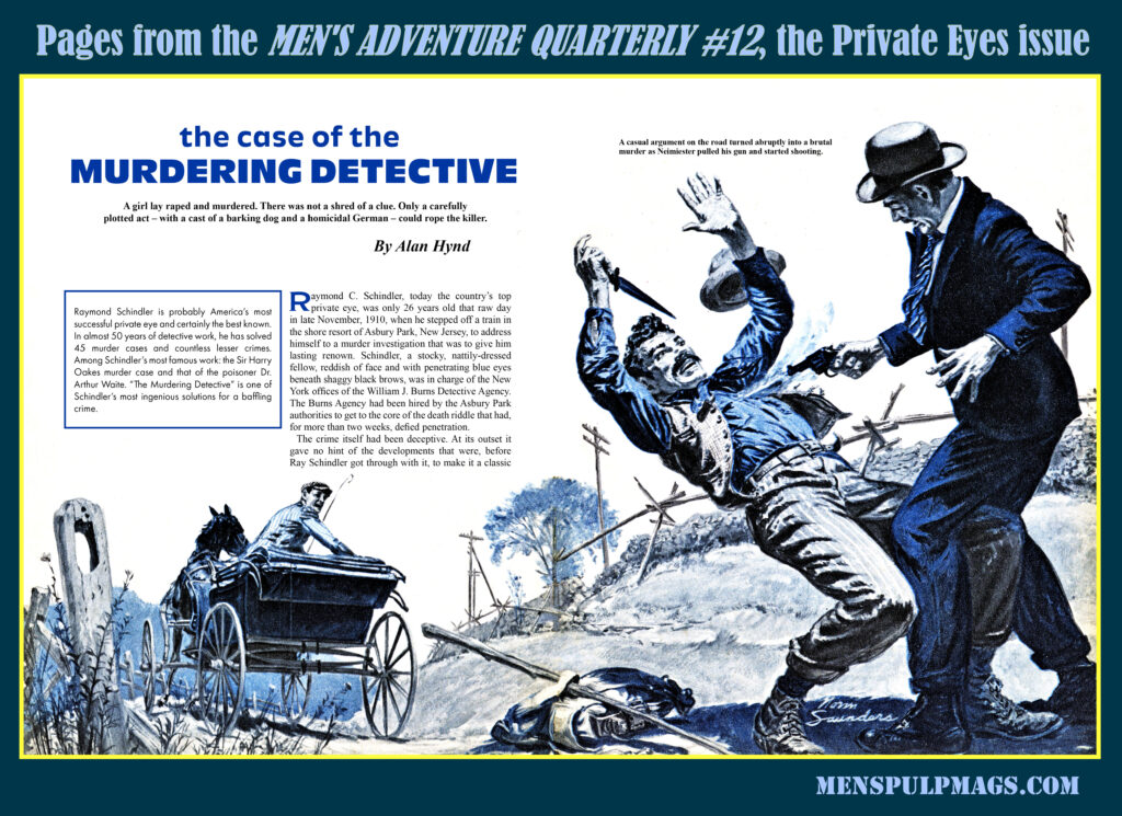 The first vintage detective story reprinted in MAQ #12 is “The case of the Murdering Detective” by Alan Hynd, first published in the September 1956 issue of CAVALIER. It’s about the real life detective Raymond C. Schindler, who was internationally famous from 1910 until his death in 1959. His first major case, involving the murder of a young girl that’s the subject of Hynd’s story, generated nationwide headlines and catapulted Schindler to worldwide fame.