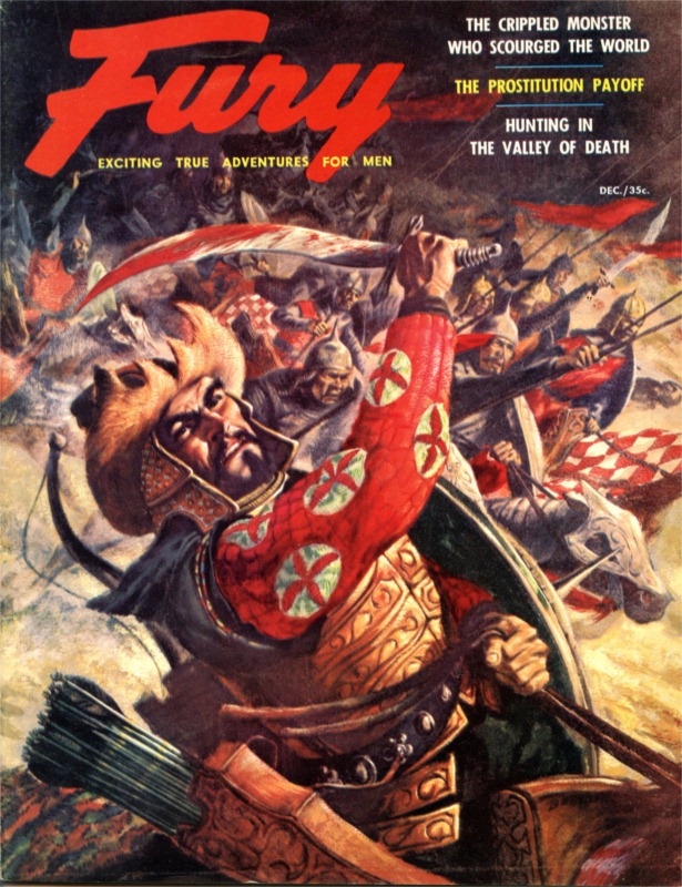 The cover of the December 1955 issue of the men’s adventure pulp magazine Fury shows a fierce image of “the Mongol Monster” Tamerlane raising a bloody sword, painted by Tom Beecham.