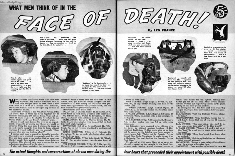 “WHAT MEN THINK OF IN THE FACE OF DEATH,” another story about the bravery of American bomber crews, this time B-24 crews in the South Pacific; and,