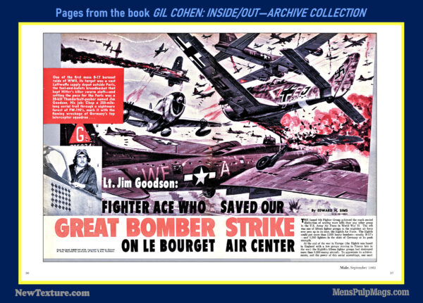 Tens of millions of readers are familiar with the iconic paperback cover paintings Gil Cohen for Don Pendleton‘s novels featuring “The Executioner”—Mack Bolan. His original paintings for those novels are showcased in the book ONE MAN ARMY: THE ACTION PAPERBACK ART OF GIL COHEN. Cohen is also well known for the large-scale paintings of American pilots and aircraft he did for galleries and prints starting in the late 1980s. They’re featured in the book GIL COHEN: AVIATION ARTIST. The skills Cohen used to create his paperback and military aviation art were initially developed by doing cover and interior illustrations for men’s adventure magazines.