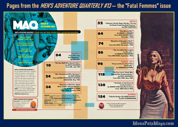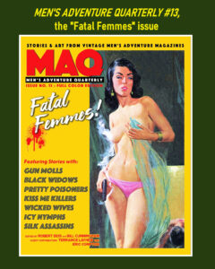 This is a copy of the full color print edition of the MEN’S ADVENTURE QUARTERLY #13, the “Fatal Femmes” issue. It includes classic stories about deadly dames from vintage men’s adventure magazines, along with high quality reproductions of the covers and interior art—plus Paperback Warrior Eric Compton’s reviews of his favorite vintage paperback novels that feature murderous women, an article about fatal femme characters in James Bond movies by podcaster/novelist Terrance Layhew, and more. Here’s an overview of the contents…