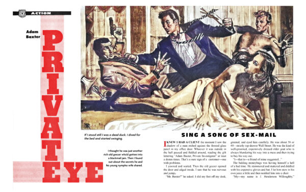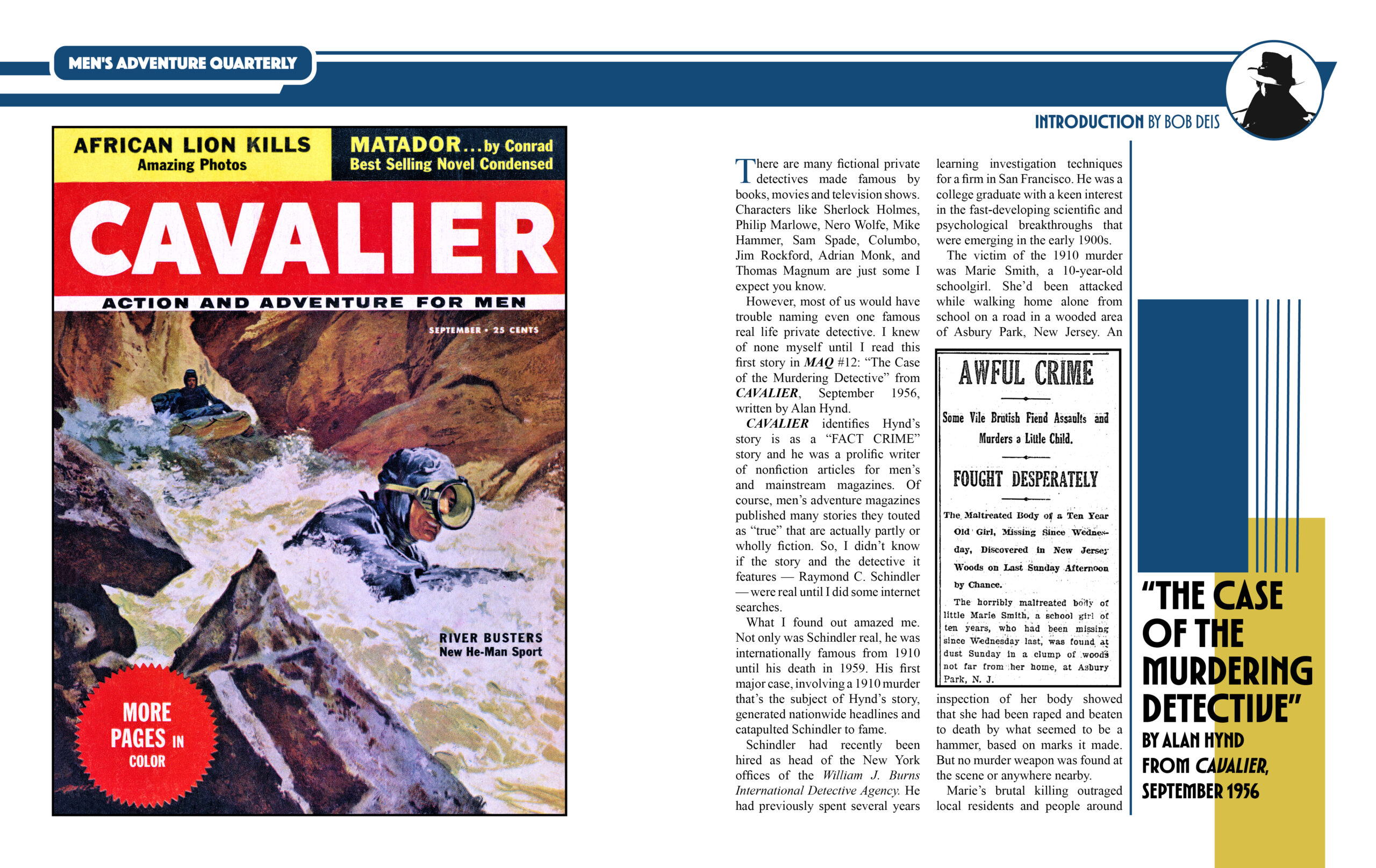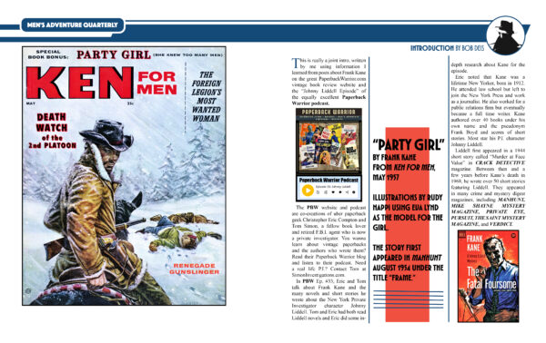 The MEN’S ADVENTURE QUARTERLY #12, the Private Eyes issue, reprints classic detective stories from vintage men’s adventure magazines and high quality scans of the related cover and interior art. The stories include: