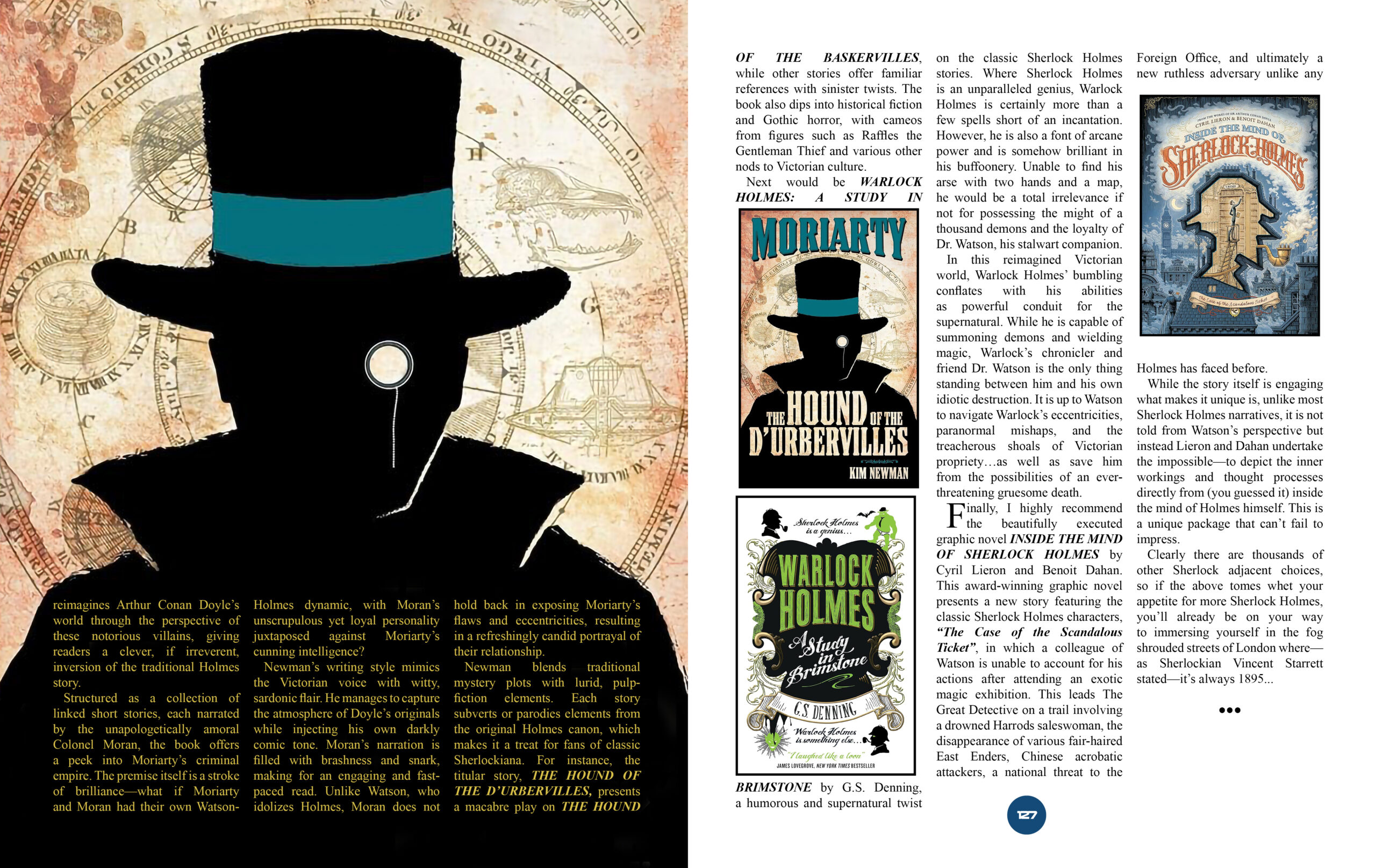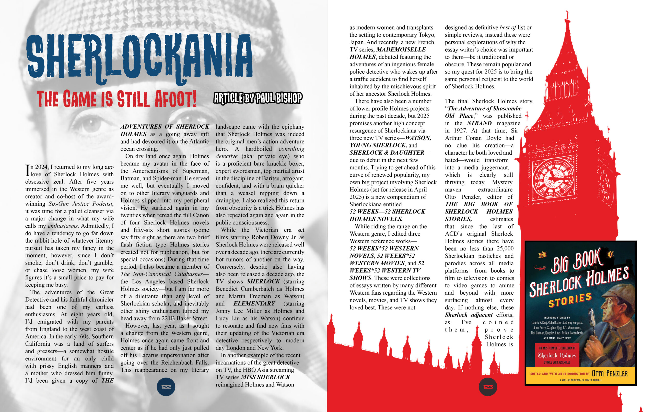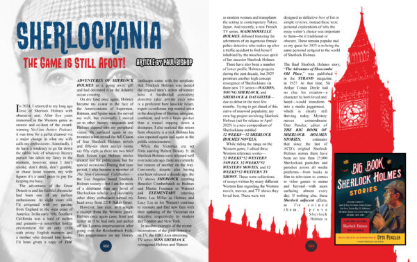 ● a “Sherlockiana” article about modern incarnations of Sherlock Holmes by Paul Bishop (whose new book is 52 WEEKS • 52 SHERLOCK HOLMES NOVELS);