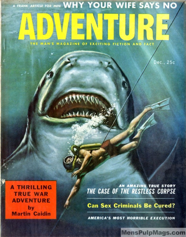 There’s an even bigger, Megalodon-size shark menacing a diver on the December 1957 issue of ADVENTURE. That awesome cover painting is by Harry Schaare.