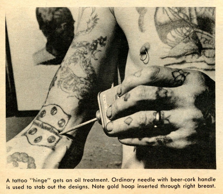 “In the Navy, they don’t have electric needles,” the article explains. “An ordinary needle, with a beer-cork handle, is used to stab out the designs. Various printing inks, including India ink, are pressed into the wounds, which may fester uncomfortably for several weeks before ‘healing.’”