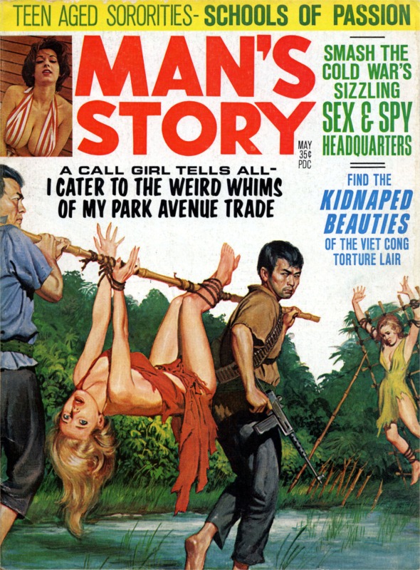 In the painting on the next cover, MAN’S STORY, May 1966, the bad guys are Viet Cong. This one was done by John Duillo for the story “FIND THE KIDNAPED BEAUTIES OF THE VIET CONG TORTURE LAIR.”